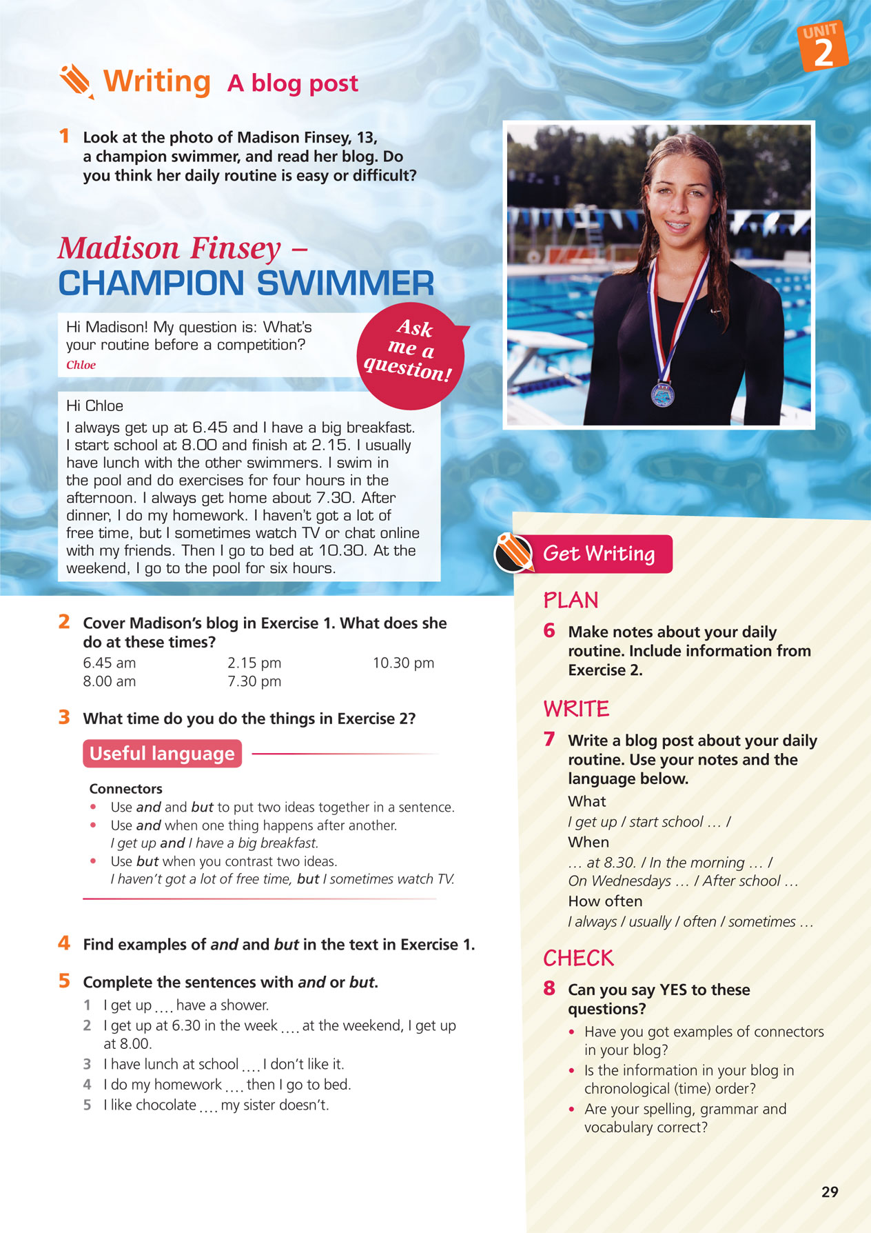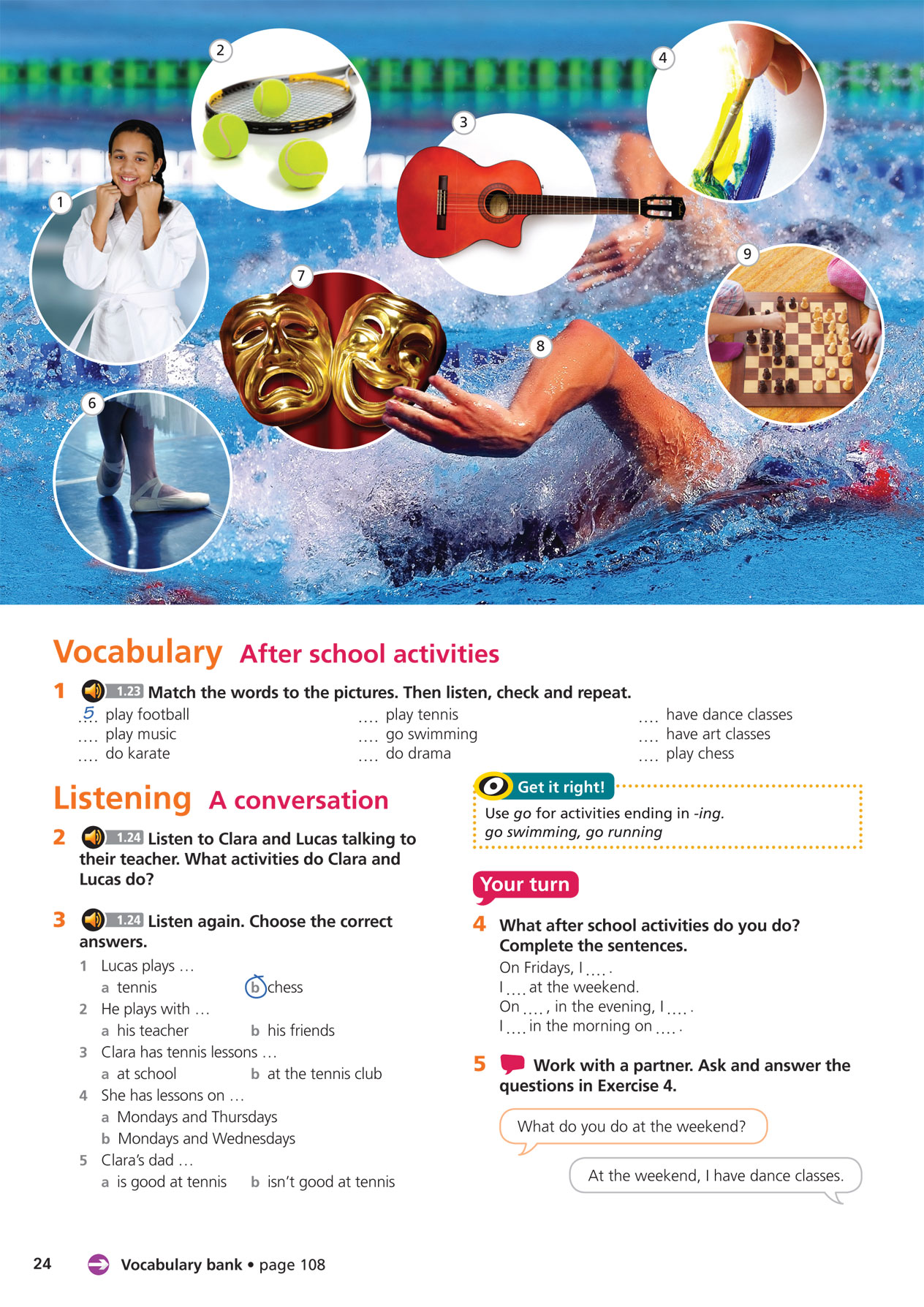 CLARA: I have lessons on Mondays and Wednesdays and I often play with my dad at the weekend. I love tennis!